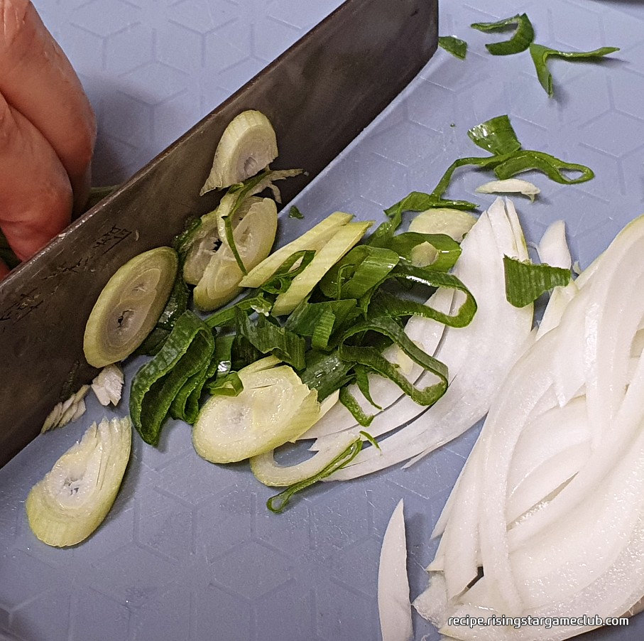 그런 다음 양념으로 들어갈 야채들을 손질해 주겠습니다. 양파 1/4쪽은 회 먹을 때 크기로 얇게 썰어 주시고요. 대파 1/3쪽과 꽈리 고추 2개는 라면에 넣는 크기로 채 썰어 주시면 됩니다.
