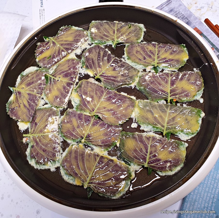 이제 깻잎에 계란물 입혀서 160도 정도 온도의 팬에 앞뒤로 뒤집어 가면서 고루 부쳐주면 맛있는 깻잎 전이 완성됩니다.