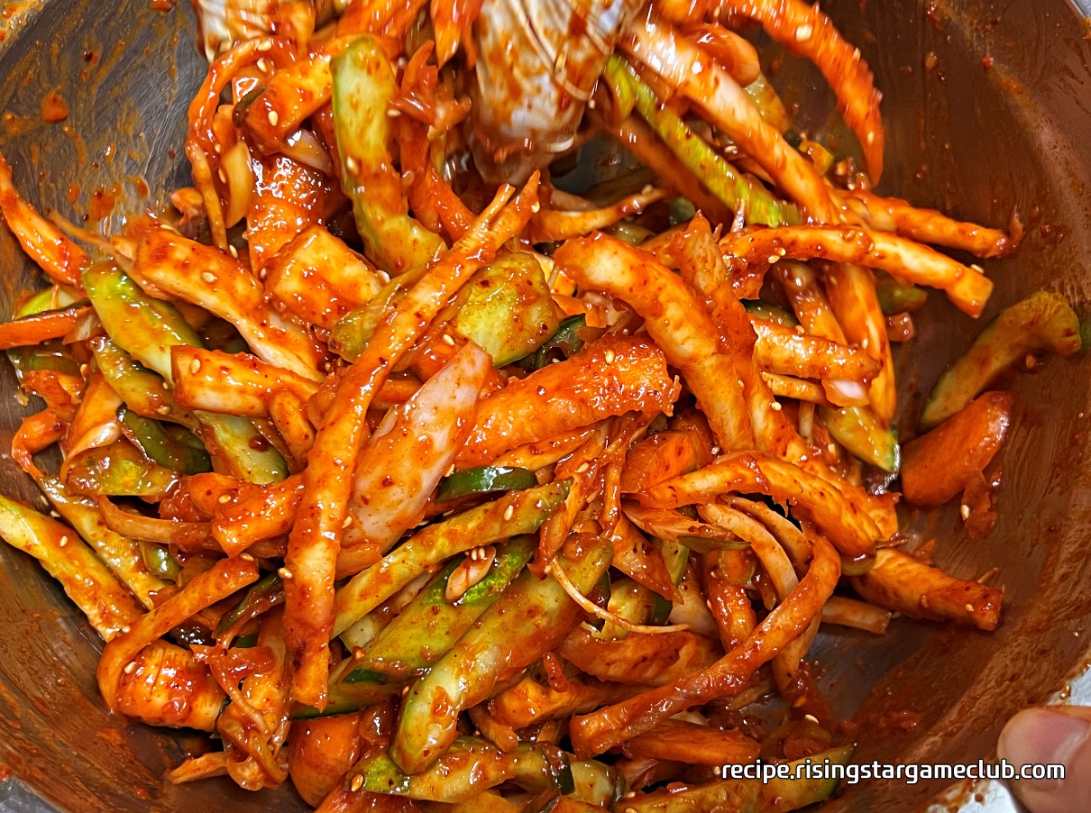 도라지 무침에 들어갈 양념장 완성 사진도라지 무침에 들어갈 양념장을 도라지와 야채에 넣은 사진