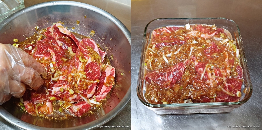 고기 전체에 만들어 놓은 양념이 잘 묻도록 듬뿍 발라 주겠습니다.