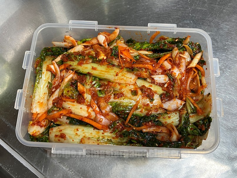 통깨 솔솔 뿌리고 한번 더 잘 섞어 주세요. 간을 보시고 부족하다 싶으시면 액젓을 조금 더 넣고 추가 간을 하시고 잘 버무리시면 됩니다. 통에 넣으실 때는 살짝 눌러서 숨구멍 없이 잘 담아 주세요. 김장 김치를 담글 때 군내가 나지 않도록 꾹꾹 눌러 담는 건데 겉절이는 금방 먹는 용도지만 혹시 모르니까요.