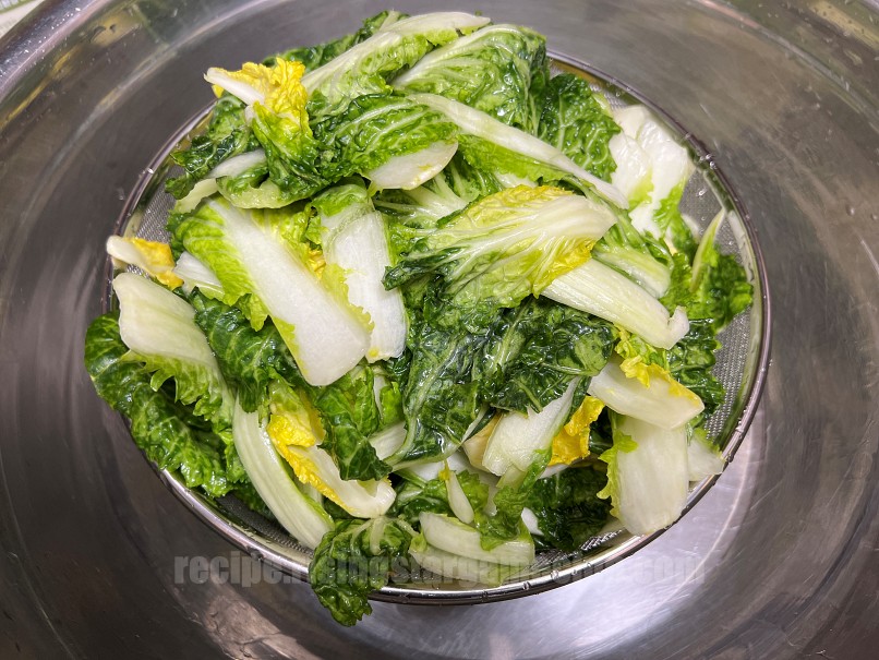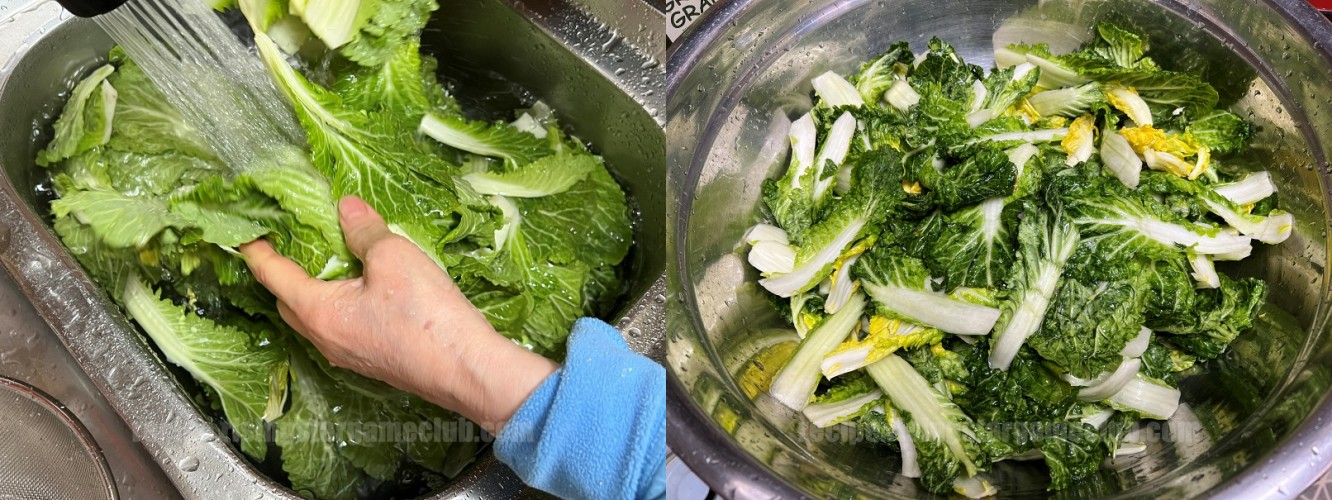 잘 절여진 봄동 배추를 물 조금 부어서 한번 씻어 주시면 되는데요. 너무 깨끗하게 소금기 다 씻어내실 필요는 없고요. 사진에 보이는 것처럼 물 조금 받아서 헹군 다음 채반에 밭쳐서 주시면 돼요.