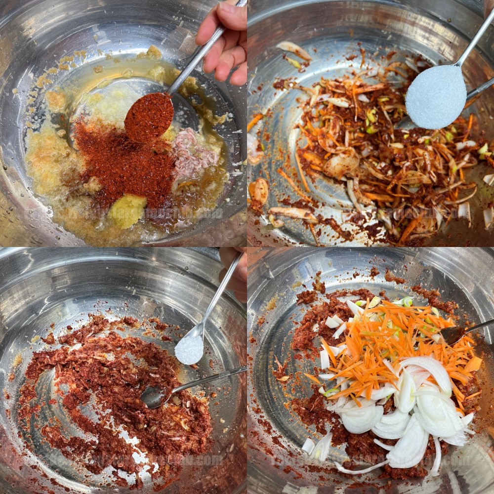 여기에 다진 마늘 2T, 생강 1T, 굵은 고춧가루 7T, 멸치액젓 3T, 새우젓 1T, 매실액 2T, 설탕 1T, 미원 1Ts를 넣고 잘 섞어 줍니다. 새우젓은 조금 많은 한 숟갈이더라고요. 사진 보시고 가늠해 주세요.