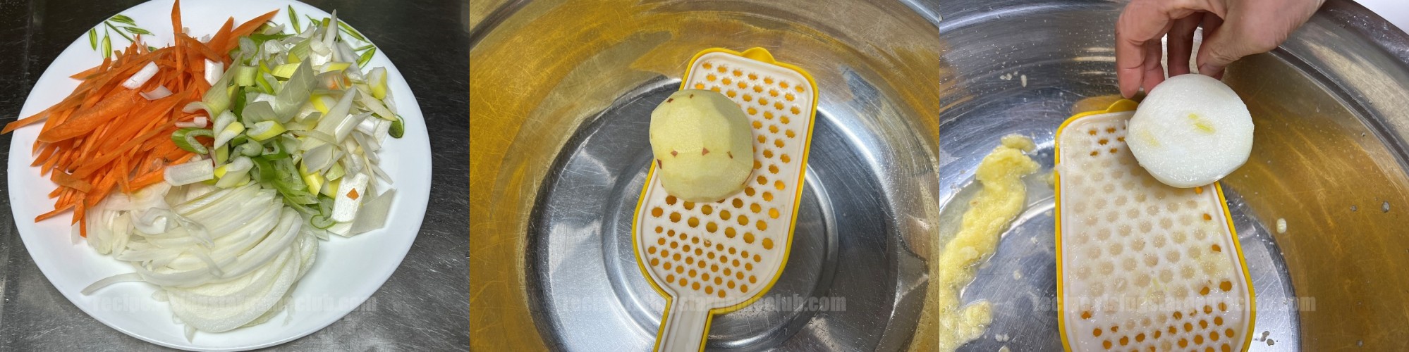 당근, 양파는 채 썰어 주시고요. 파는 라면에 넣는 파 크기로 썰어주세요. 그리고 강판에 사과 반 개, 양파 반 개를 갈아서 넣어 주세요. 핸드블랜더나, 믹서기로 하셔도 됩니다.