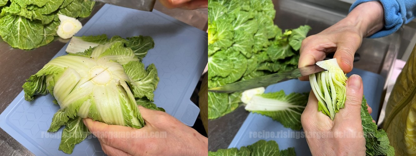 우선 봄동을 손질해 줄 건데요. 뿌리 부분에 칼집을 열십자로 내서 잘라주시고요. 잎들이 붙어있는 뿌리부분을 잘라서 잎사귀를 분리해 줍니다.