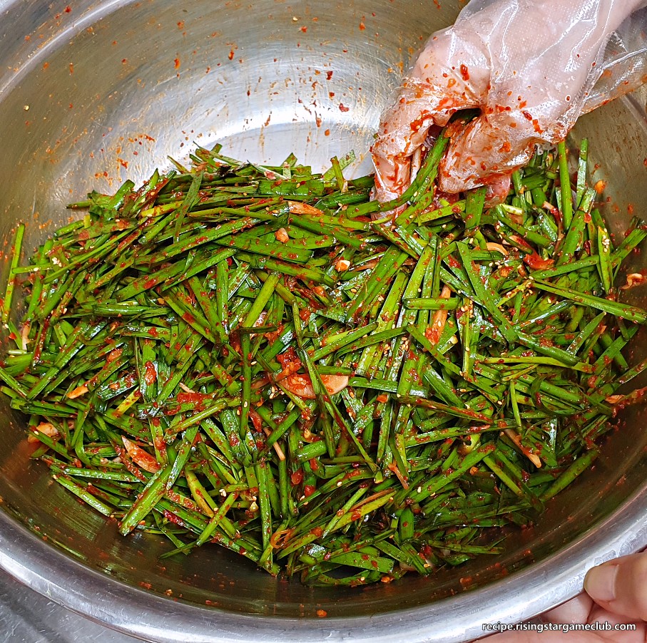 부추 1단, 양파 1/2개, 간 마늘 2T, 새우젓 2T, 멸치 액젓 2T, 매실액 2T, 고춧가루 6T, 설탕 1T, 통깨 많이 솔솔