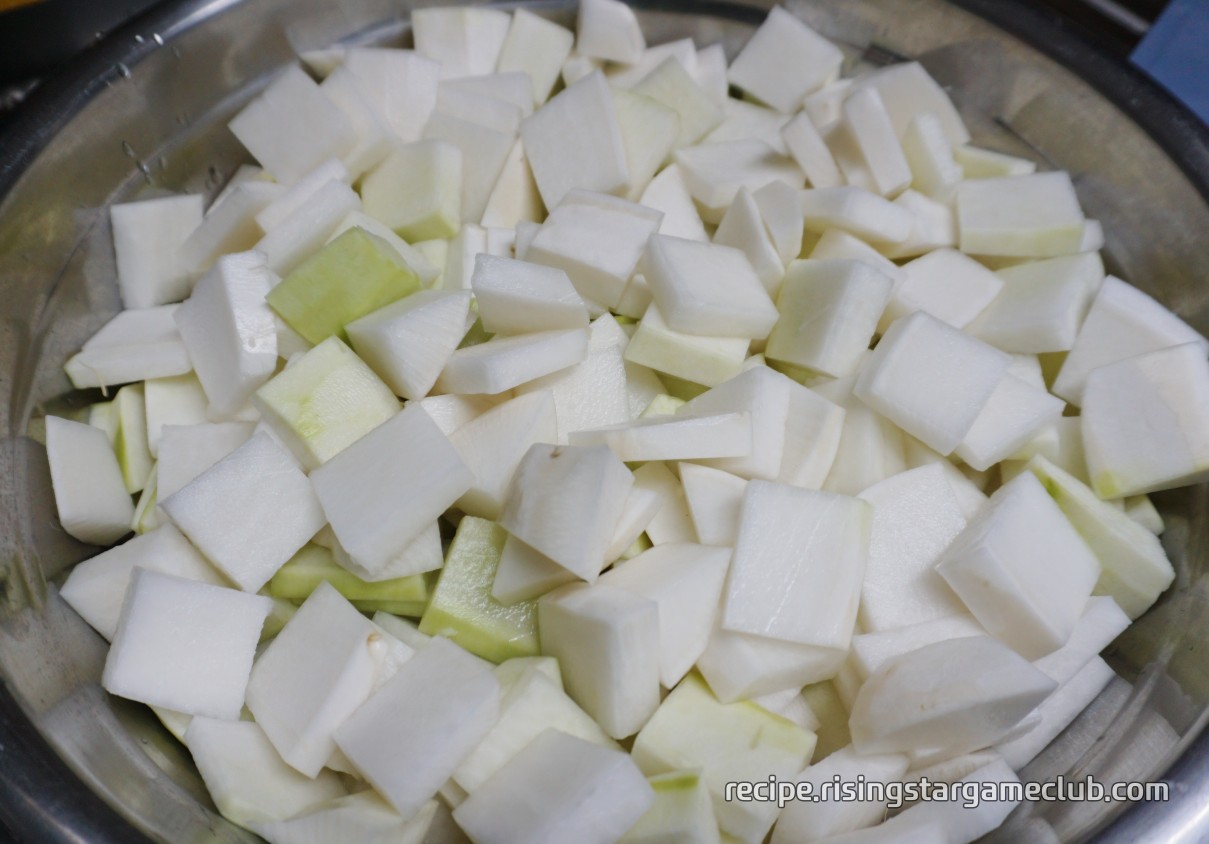 큰 무 다섯 개, 파 두 뿌리, 양파 한 개, 고춧가루 2컵, 새우젓 반컵, 멸치 액젓 반컵, 굵은 소금 반컵, 뉴슈가 1Ts, 설탕 2T, 다진 마늘 2T, 생강청 1T.