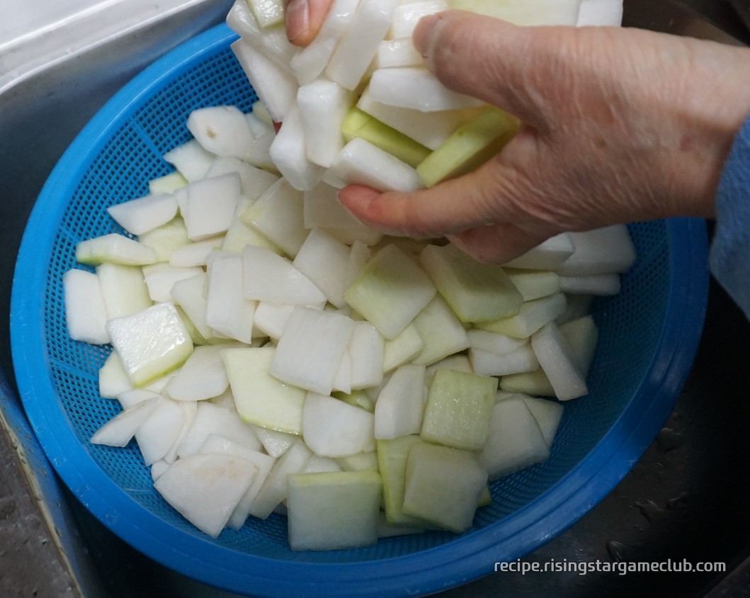 무가 절여지면서 물이 나오기 때문에 절여진 무를 채반에 옮겨 담아 물기를 제거해 주고 다시 양푼에 옮겨 담습니다. 씻거나 물을 일부러 짜거나 하실 필요는 없습니다.