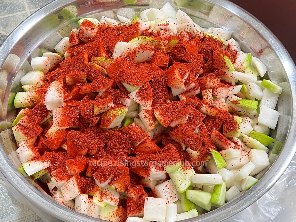 이제 절여진 무에 고춧가루를 2컵 뿌리고 먼저 빨갛게 물들여 줄거에요. 양념을 하기 전에 이 작업을 먼저 해 줘야 빨갛게 예쁘게 석박지에 물이 든다고 하시네요. 물이 고루 들 때까지 버무려 주세요.