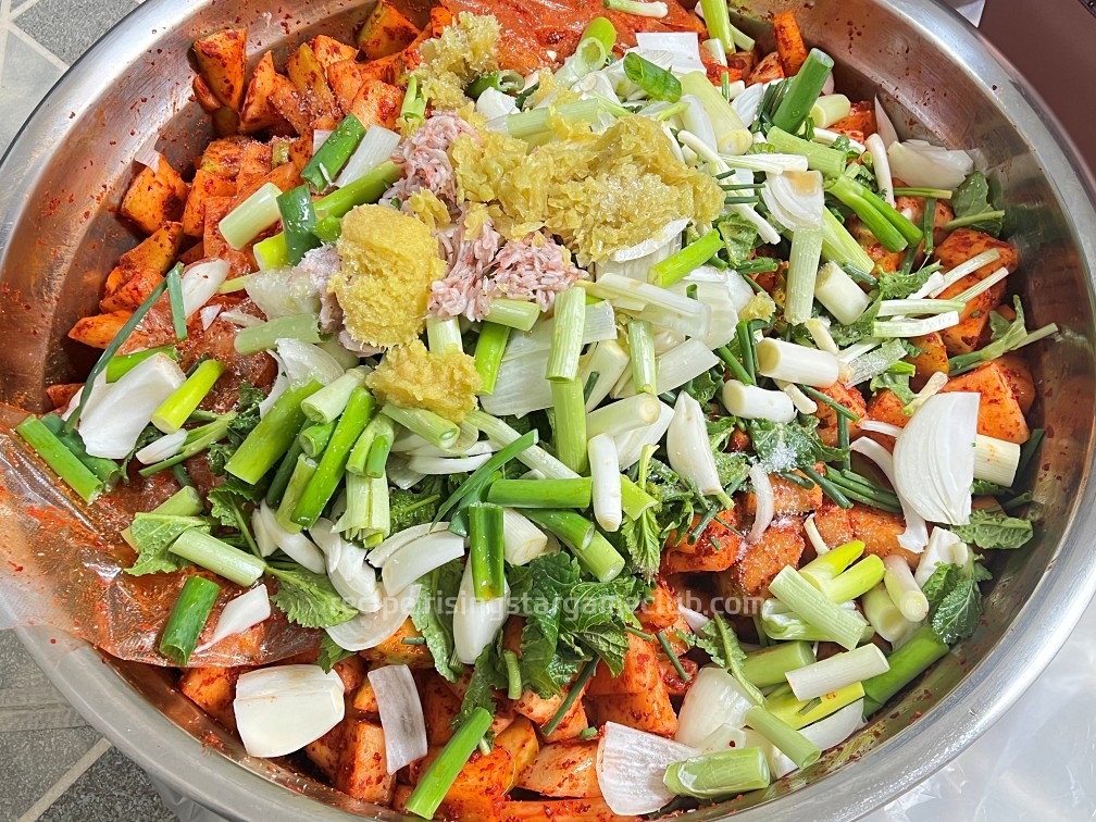그런 다음 손질해 놓은 파 두 뿌리, 양파 한개, 다진마늘 2T, 생강청 1T, 새우젓 반컵, 멸치액젓 반컵을 넣고 잘 버무려 줍니다. 집에 갓이 있어서 사진에는 갓이 조금 들어 갔네요. 안넣으셔도 무방합니다.