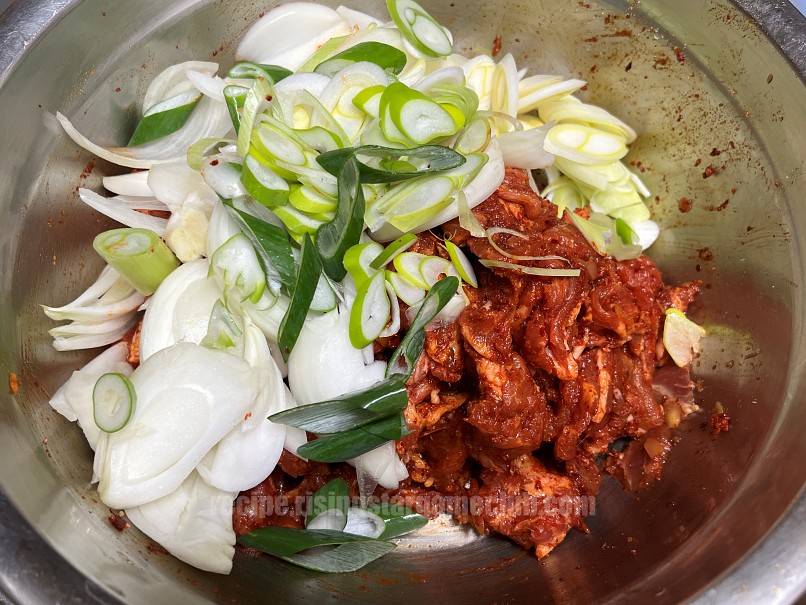 돼지고기 한근(600g), 파 한뿌리, 양파 한 개 반, 다진 마늘 1T, 다진 생강 2Ts, 고추장 1/2T, 양조간장 2.5T, 통깨 한꼬집