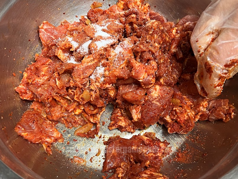 그리고 고추장을 1/2T, 고춧가루를 4T 넣어 줍니다. 재료에는 고춧가루 5T라고 적어 두었는데 1T는 뒤에 따로 쓸데가 있습니다. 만약에 삼겹살을 사용하시는 경우에는 양념에 5T를 다 넣으시면 됩니다. 여기까지 넣은 후 양념이 골고루 묻도록 무쳐줍니다.