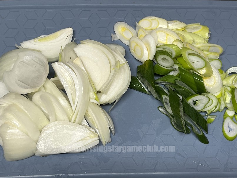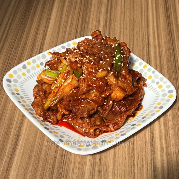 돼지고기 한근(600g), 파 한뿌리, 양파 한 개 반, 다진 마늘 1T, 다진 생강 2Ts, 고추장 1/2T, 양조간장 2.5T, 통깨 한꼬집