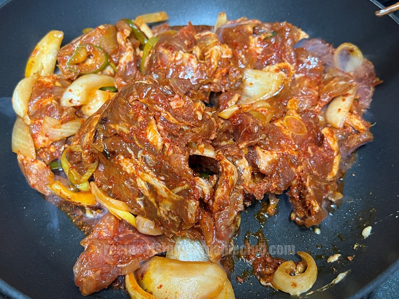 볶을 때 프라이팬에 식용유 1T 두르고 남겨두었던 고춧가루 1T를 넣고 약불에 고추기름을 내줄 건데요. 센 불에 하면 고춧가루가 검게 타버리게 됩니다. 삼겹살을 사용하시는 경우에는 기름이 많아서 식용유를 두르고 볶으면 기름탕이 되어 버릴 수 있습니다. 그래서 고기 잴 때 양념으로 고춧가루를 5T를 전부 넣는 것으로 설명드렸습니다.