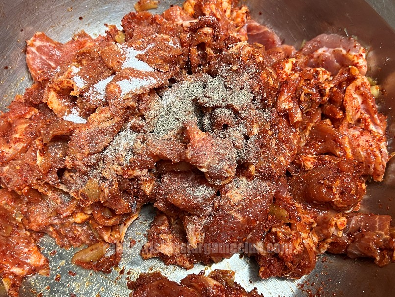 그리고 고추장을 1/2T, 고춧가루를 4T 넣어 줍니다. 재료에는 고춧가루 5T라고 적어 두었는데 1T는 뒤에 따로 쓸데가 있습니다. 만약에 삼겹살을 사용하시는 경우에는 양념에 5T를 다 넣으시면 됩니다. 여기까지 넣은 후 양념이 골고루 묻도록 무쳐줍니다.